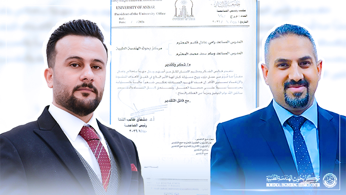 The staff of the Biomedical Engineering Research Center extend their sincere congratulations and best wishes to Assistant Lecturer Rami Adel Qasim and Assistant Lecturer Wissam Saad Mohammed on the occasion of receiving a Letter of Appreciation from the President of the University of Anbar, Professor Dr. Mushtaq Talib Al-Nida, in recognition of their distinguished scientific efforts and valuable academic contributions. On this occasion, the Center’s staff, led by the Director of the Medical Engineering Research Center, Assistant Professor Dr. Ali Amer Al-Rawi, express their pride and appreciation for this well-deserved recognition, which serves as a strong motivation to continue the path of academic excellence and research productivity, and reflects the high level of commitment and responsibility demonstrated by the Center’s members. We wish them continued success and further scientific achievements that contribute to serving the University and advancing the research mission at both the national and international levels.
