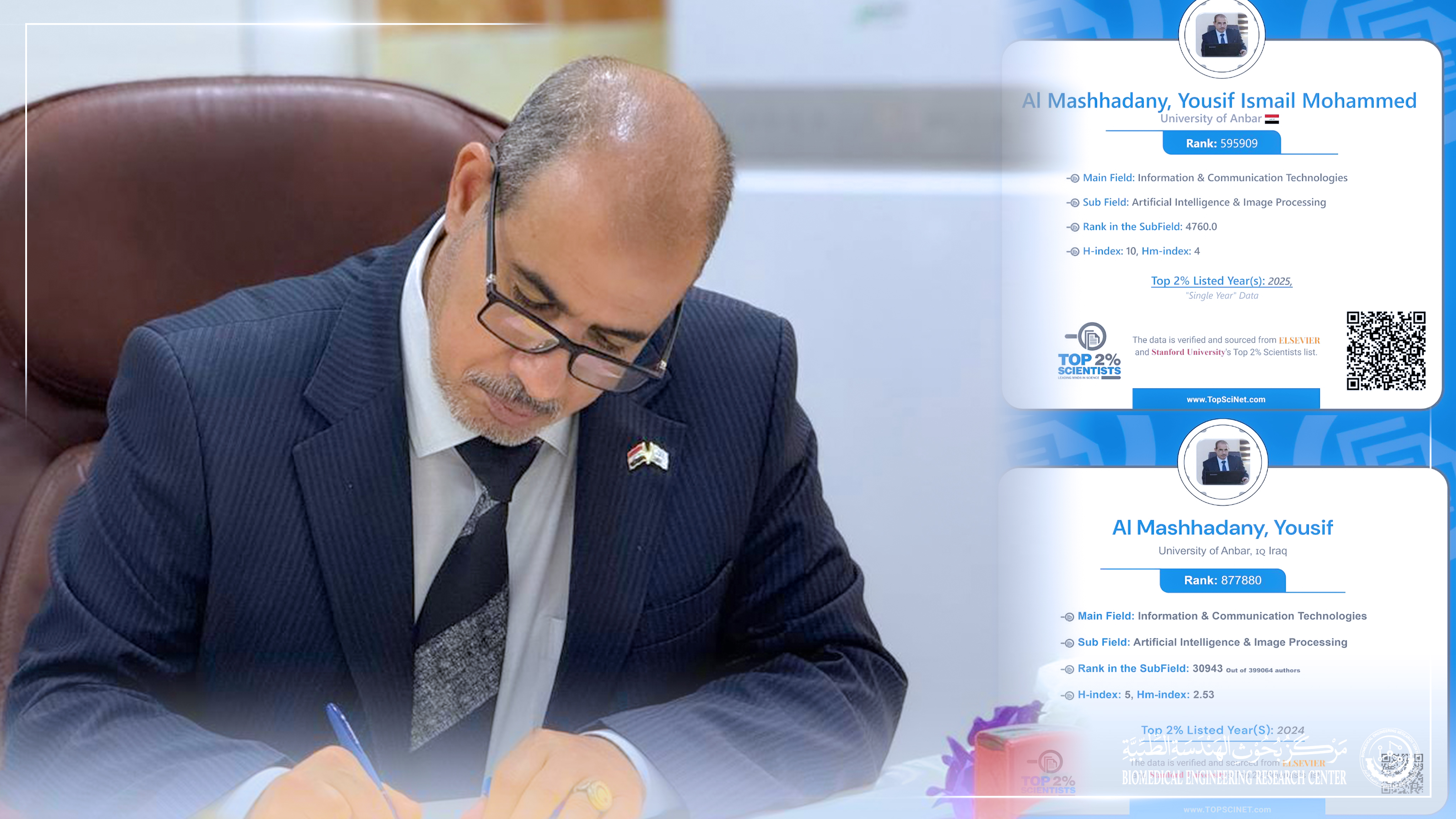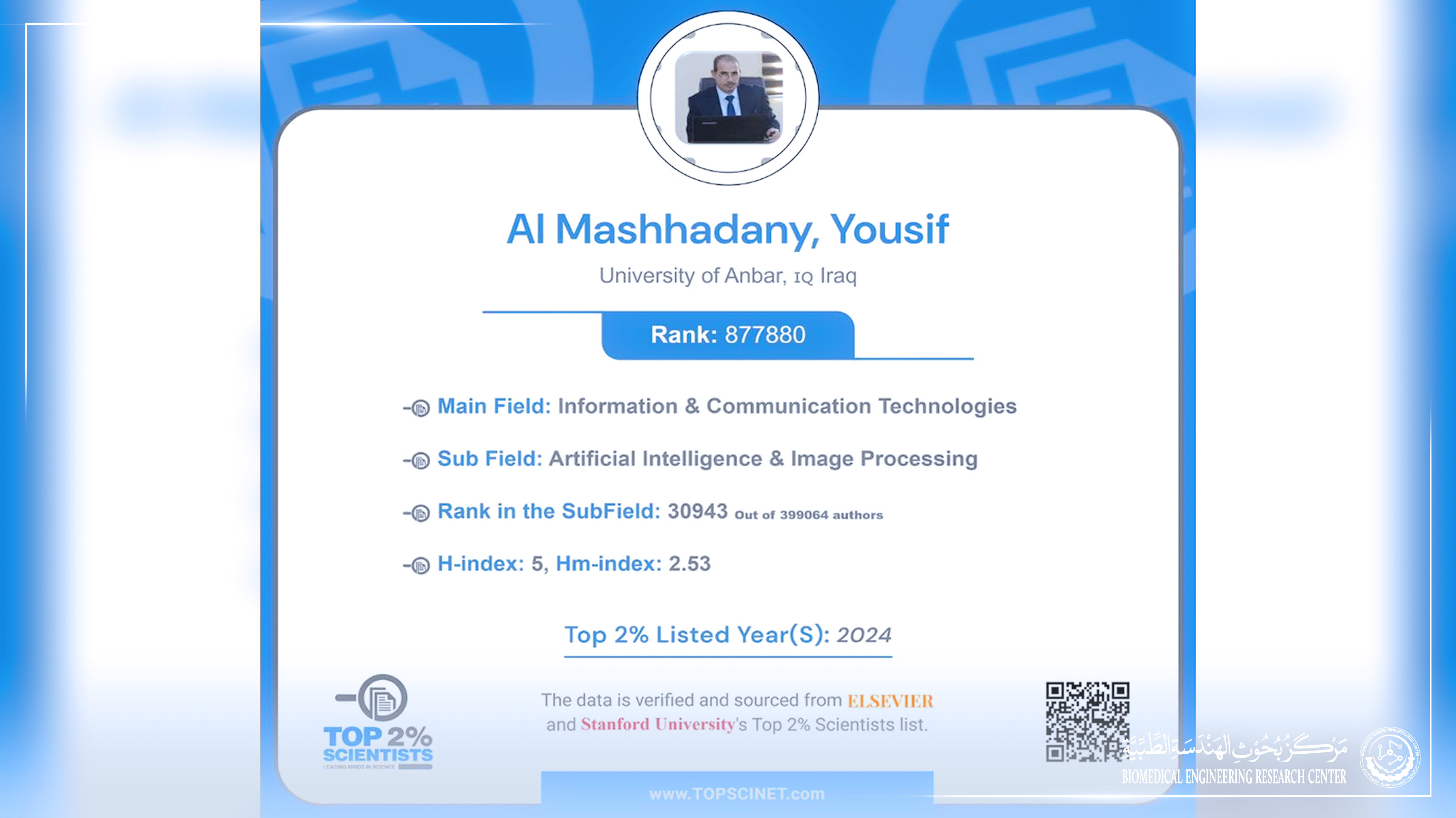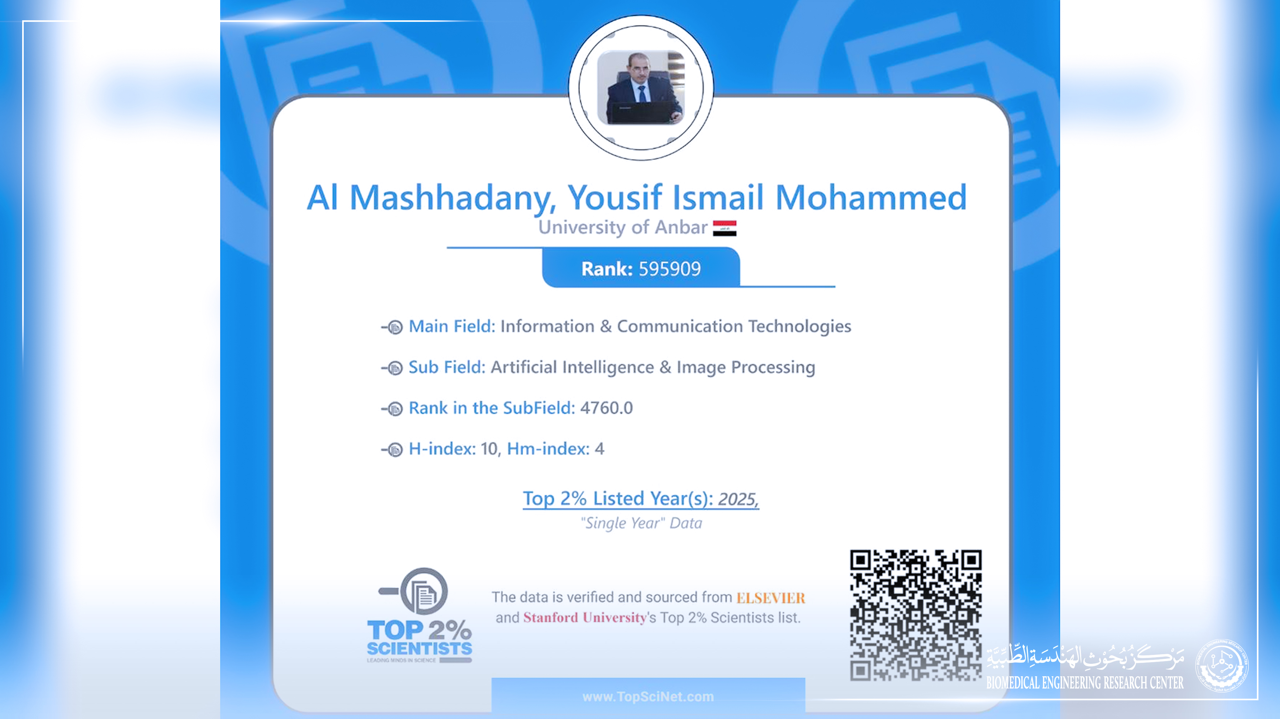 The Biomedical Engineering Research Center at the University of Anbar, led by its Director Assistant Prof Dr. Ali Amer Al-Rawi, extends its warmest congratulations to Prof Dr. Yousif AlMashhadani on the distinguished occasion of his inclusion—for the second consecutive year (2024 and 2025)—in the prestigious World's Top 2% Scientists Network. This remarkable achievement crowns a career rich in scholarly contributions and impactful research, underscoring the University of Anbar’s growing presence on the global academic stage. The recognition is based on a rigorous, data-driven analysis of citation records and research performance, carried out independently by a research team at Stanford University in collaboration with Elsevier. Prof AlMashhadani’s inclusion reflects the depth and influence of his scientific work, as well as his sustained commitment to advancing knowledge within his field. His publications and pioneering studies have not only enriched the scientific community but have also inspired future generations of researchers and students. Notably, he has been recognized in both the Single-Year Impact list for 2025 and the Career-Long Impact list, demonstrating both immediate and long-term research excellence. The entire team at the Biomedical Engineering Research Center proudly celebrates this honor, viewing it as a testament to Prof Al-Mashhadani’s exceptional scholarly achievements and as an inspiration for continued academic advancement in Iraq and beyond.
